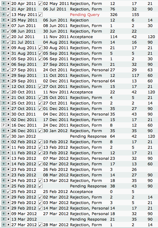 Around this time two years ago (as I commemorated last year) I started submitting short fiction in earnest and except for a few dry spells, have not stopped. Except for November (during which time I was working on a novella) I have submitted at least one story each month for the last year: 53 stories. I sold three (Unintended Consequences, Expired, and Whalefall) and several are still waiting for responses. Of the remaining, 7 got personal rejections (if only a “PS” at the bottom of the form). Some of those are reprint subs, a first for me this year.